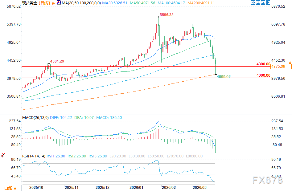 日线图显示价格上周暴跌至4,400-4,500美元强支撑区,早盘测试4,098-4,200美元关键低点后反弹。RSI(14)进入超卖区(约26-30附近),显示极端卖压,潜在反弹信号。MACD持续下行,但柱状图收窄,暗示空头动能减弱,可能出现底背离。